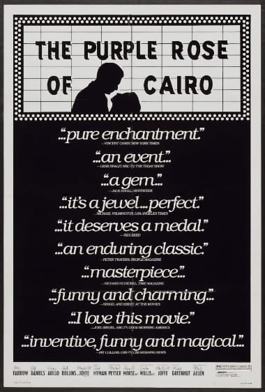 – Roger Ebert wrote: “‘The “Purple Rose of Cairo’ is audacious and witty and has a lot of good laughs in it, but the best thing about the movie is the way Woody Allen uses it to toy with the very essence of reality and fantasy. The movie is so cheerful and open that it took me a day or two, after I’d seen it, to realize how deeply Allen has reached this time. If it is true, and I think it is, that most of the time we go to the movies in order to experience brief lives that are not our own, then Allen is demonstrating what a tricky self-deception we practice. Those movie lives consist of only what is on the screen, and if we start thinking that real life can be the same way, we are in for a cruel awakening.”